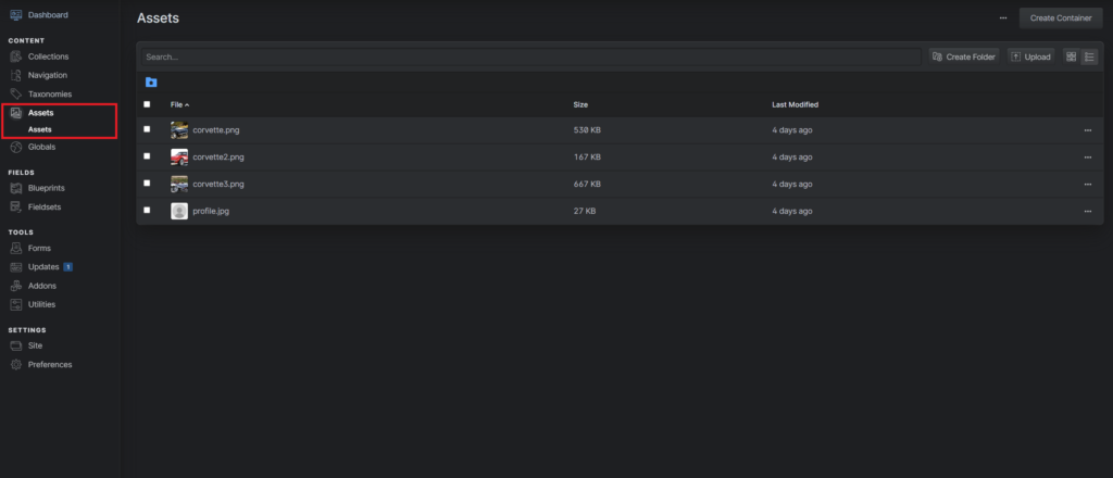From the control panel, you can upload, browse, organize, and edit metadata (alt text, titles, etc.) for each file. Assets can then be selected inside entries via blueprint fields, making them reusable and centrally managed across your site.
