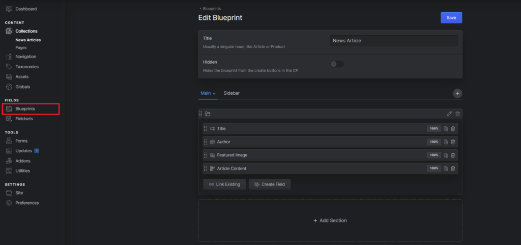 If collections are containers for content, blueprints are the “form builder” that defines what content fields exist inside them.