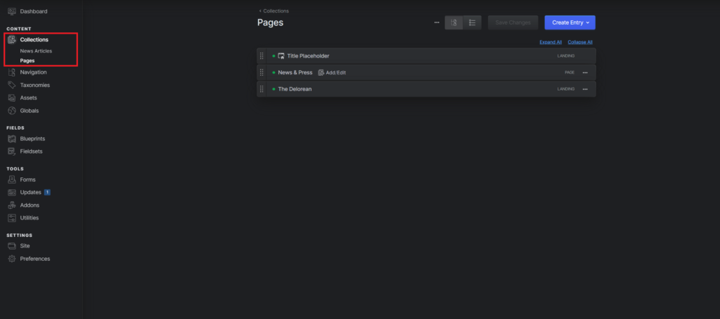 Collections are groups of content entries similar to “post types” in other CMS platforms.