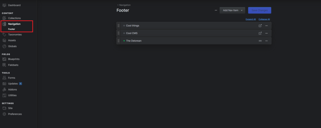 Navigation is separate from collections — it’s purely for organizing how links appear in your frontend.