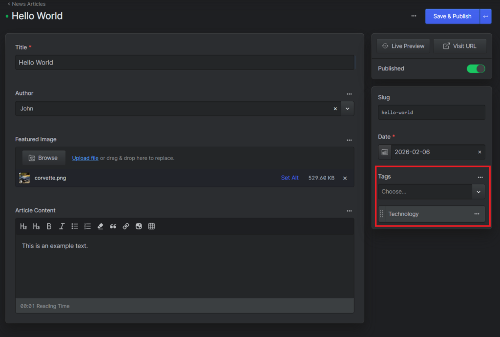 I didn’t use Taxonomies to extensively but i did use them for some extra visuals for the news page for the entries there. So as mentioned you take the double curly braces “{{ }}” and then add whatever you wish which is in this case “tags”. The tag is the name of the Taxonomy used in my case and the “limit=1” is just here so only one is shown even if more are assigned but in my instance that isn’t the case.
